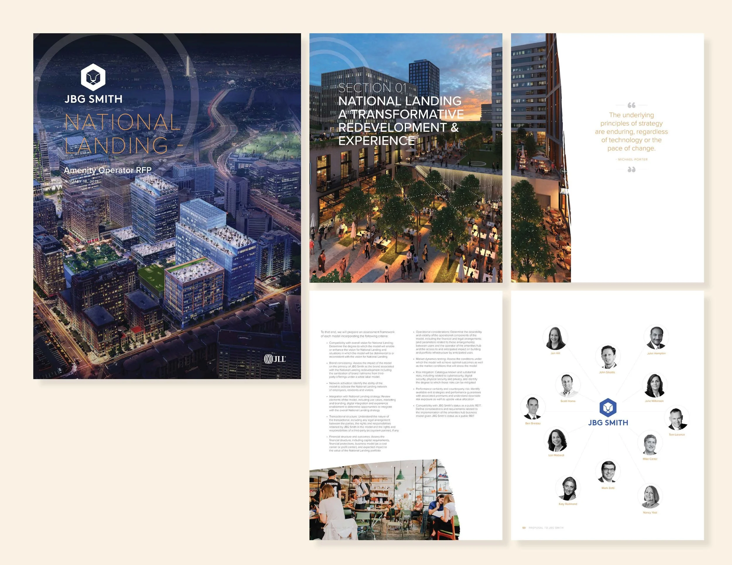 A bold, visually clear proposal for the National Landing redevelopment. Designed to communicate key plans effectively, it features strong layouts, custom infographics, and map visuals to make complex information easy to understand.